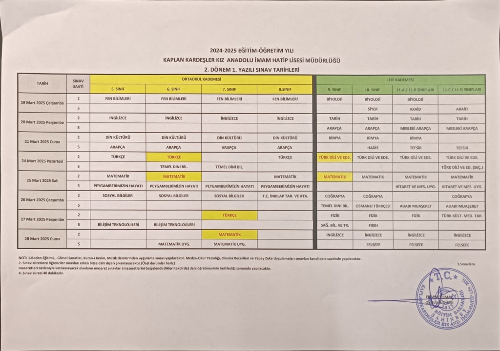 2. Dönem 1. Yazılı sınavı tarihleri. Öğrencilerimize Başarılar Diliyoruz...