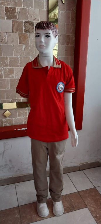 Erkek öğrenciler için üst bordo tişört alt camel rengi pantolon.